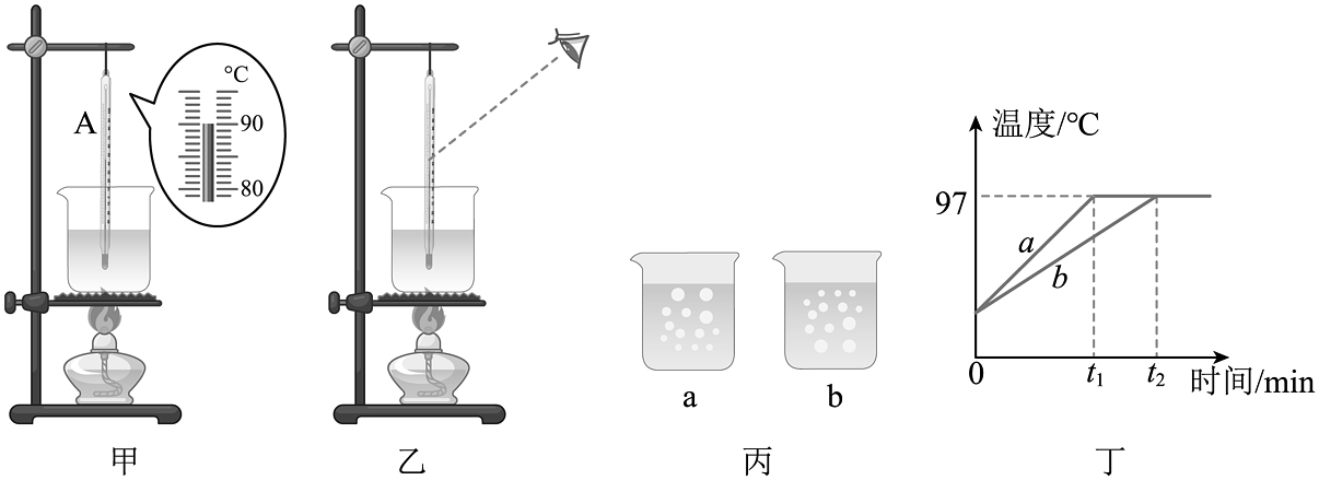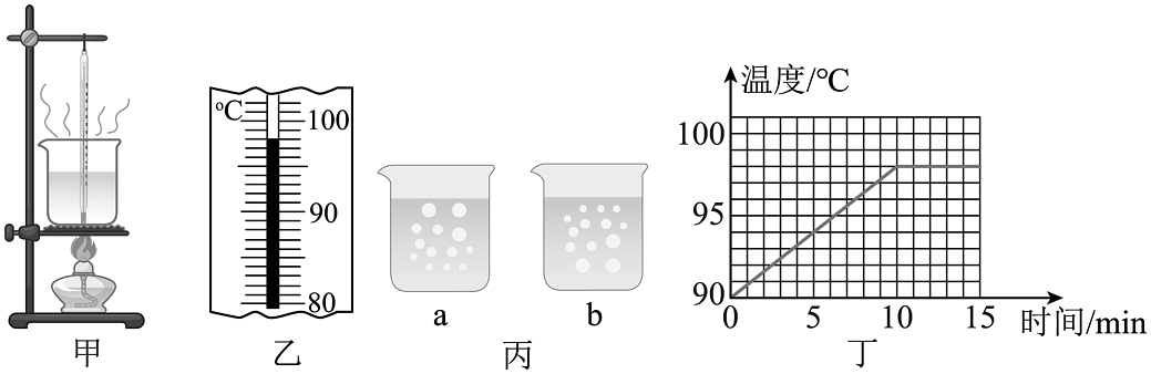 4、小凡同学在做“观察水的沸腾”的实验。请回答下列问题:(1)、他的操作如图甲所示,其中错误之处是;(2)、纠正错误后,水沸腾时温度计示数如图乙所示,为℃;(3)、在图丙中是水在沸腾时的情况(填“a”或“b”);(4)、分析图丁所示图像,可知水在沸腾过程中的特点是;(5)、本实验中,要缩短加热时间让水尽快沸腾,请写出一种可行的办法:。
