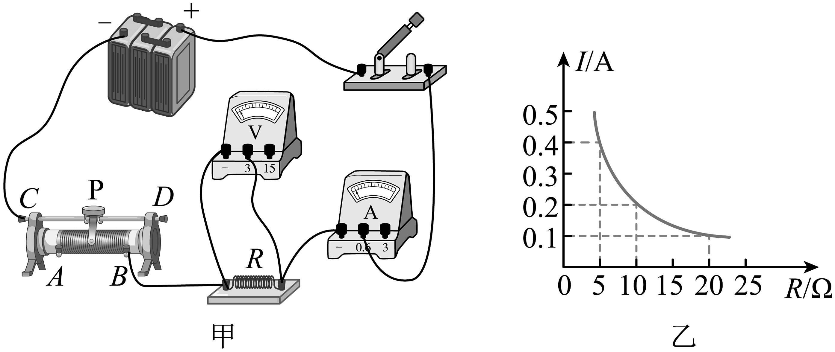 18、物理实验活动中,同学们在做“探究电流与电阻的关系”实验,选用部分器材如下:电压为6V的电源,标有“50Ω 1A”的滑动变阻器,阻值为5Ω、10Ω、20Ω、30Ω的4个电阻,其他器材如图,请帮助回答下列问题:(1)、在进行实验之前,小明先连接电路,当他接好最后一根导线后,电流表接着就有了偏转,出现这种情况的主要原因是;(2)、心雨组将电路连接后闭合开关,发现无论怎样移动滑动变阻器的滑片P,电流表均无示数,电压表指针有明显偏转,出现这种情况的原因可能是______;A、电阻R短路 B、滑动变阻器开路 C、电阻R开路 D、滑动变阻器短路(3)、他们排除故障后继续进行实验,当把5Ω电阻换成10Ω电阻后,眼睛应注视 , 手移动滑动变阻器,结合乙图请分析使电压表示数为并保持不变,记录相应数据。(4)、实验中进行多次测量的目的是。根据实验数据绘制图像,得出的结论是:。