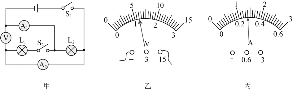 8、如图甲所示电路图,当只闭合开关S1时,电压表示数如图乙所示;当S1、S2都闭合时,两电流表的指针均如图丙所示。(1)、当S1、S2都闭合时,通过 L1的电流为多少A?(2)、当S1、S2都闭合时,灯L1两端的电压为多少V?(3)、当只闭合S1时,电流表 A1的示数为多少 A?