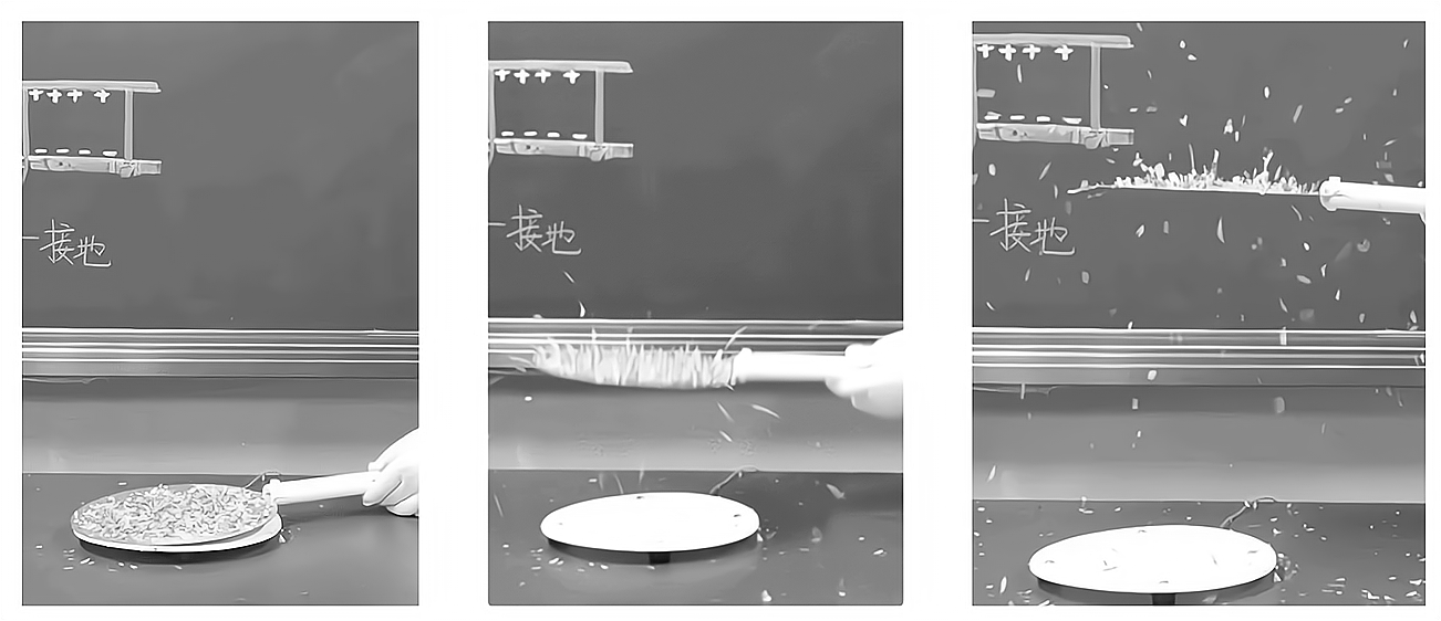 11、物理老师在课堂上演示了一个“静电飞花”的实验。老师先将用羊毛摩擦过的白色塑料盘放在桌面上,再将一个带有把手的金属盘贴紧塑料盘,在金属盘上撒一些纸屑。将金属盘抬起时,其上的纸屑就会飞散开来,如图所示。关于该实验,下列说法正确的是( )A、用羊毛摩擦过的塑料盘变成了导体 B、白色塑料盘带电是因为摩擦过程中创造了电荷 C、纸屑飞散开来是因为它们带上了异种电荷 D、该实验的原理和验电器的原理相同