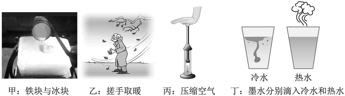 5、关于如图所示的四个情景,下列说法正确的是( )A、图甲中炙热的铁水具有内能,冰冷的冰块没有内能 B、图乙中冬天搓手取暖是将内能转化为机械能 C、图丙中通过对空气做功使空气的内能减小,温度降低 D、图丁中墨水在热水中比在冷水中扩散快,说明分子热运动的剧烈程度与温度有关