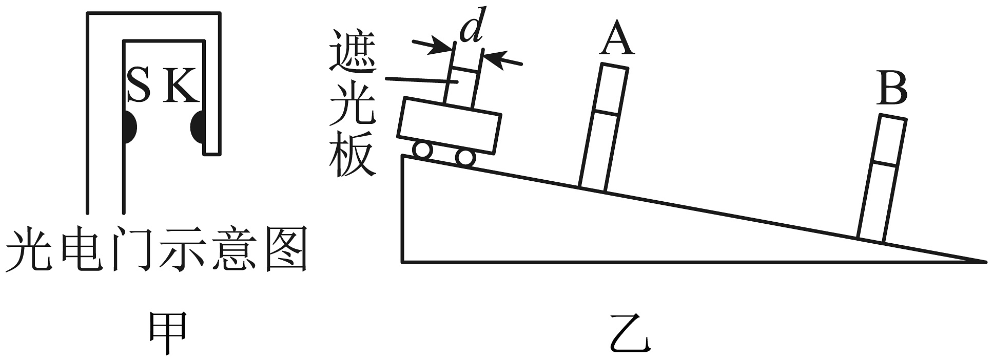 15、光电门是物理实验中用来测量时间的一种常用设备,如图甲所示,S是光源,K是光接收器,当有不透明物体通过光电门时,物体会遮住光源,接收器K接收不到光信号,计时器便开始计时,当物体通过后,接收器K重新接收光信号,计时结束,即可记录物体通过光电门所用的时间。如图乙所示,某同学用光电门测量小车沿斜面向下运动的速度,小车上安装有遮光板,A、B是安装在斜面上不同位置的两个光电门。(1)、若已知遮光板宽度d=1cm,让小车从斜面顶端以一定的初速度开始沿斜面向下运动,两光电门计时器记录的时间分别为tA=0.01s,tB=0.005s,则小车通过A、B两位置的速度分别为vA=m/s,vB=m/s;(2)、由实验可知:小车沿斜面向下做(选填“匀速”“加速”或“减速”)运动。