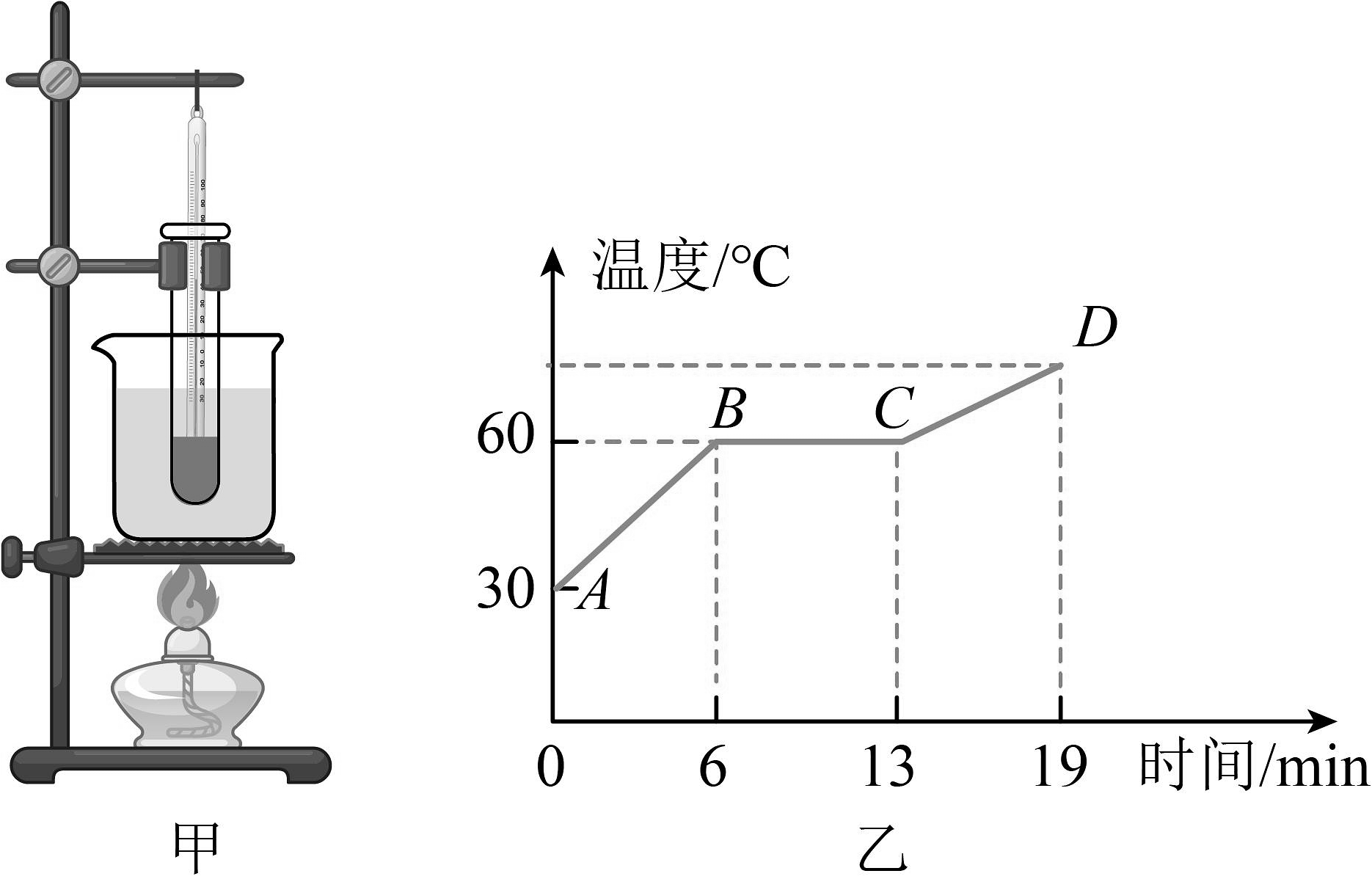 16、在“探究某固体熔化时温度的变化规律”的实验中,小明采用水浴法进行加热,如图甲所示。(1)、安装实验装置时,他应按照(选填“自上而下”或“自下而上”)的顺序进行。(2)、用水浴法加热的主要目的是使试管内的物质。(3)、小明根据实验测得的数据作出图像,如图乙所示。由图像可知,该物质的熔点是℃;晶体熔化的特点是持续吸热,温度保持。