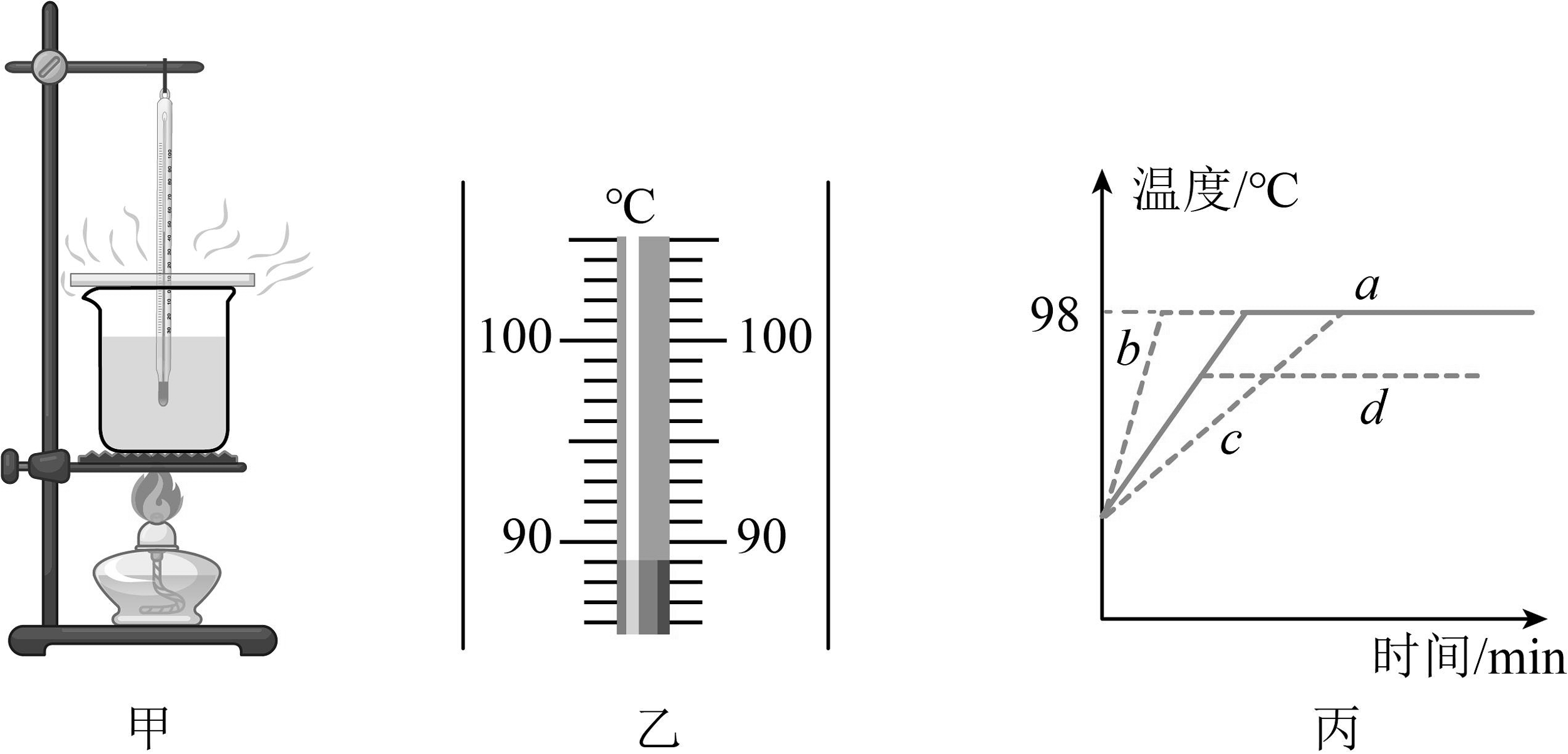 (1)、某时刻,温度计示数如图乙,温度是℃。(2)、一位同学使用相同装置,仅将水的质量减少,其他条件不变,如图丙,根据实验数据作出水温随时间变化的图像可能是______。A、a图线 B、b图线 C、c图线 D、d图线(3)、如图丙,由a图线可知,水的沸点是℃。(4)、结合图与表格,分析本实验中应选用温度计(选填“酒精”或“水银”)。 -