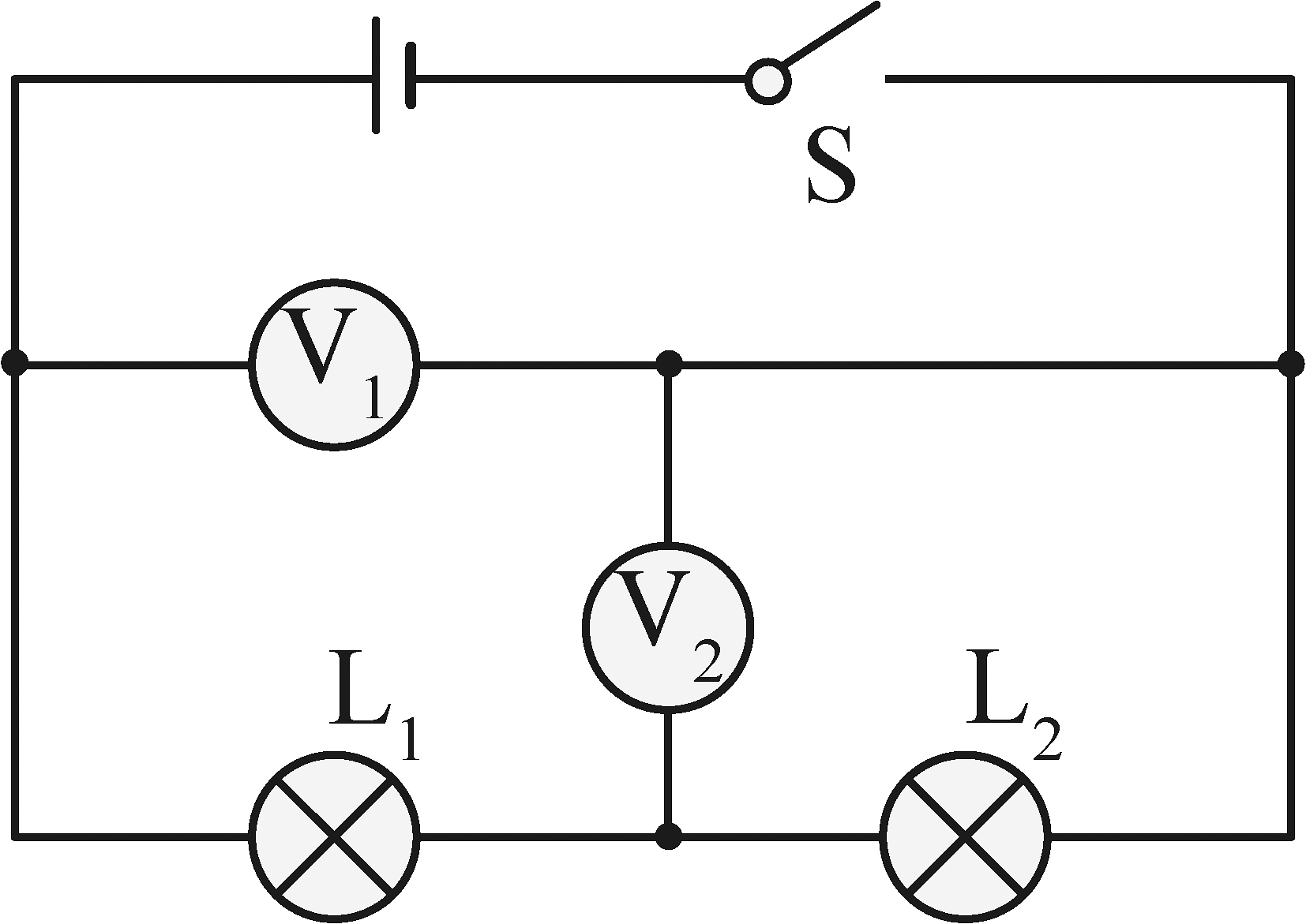 5、如图所示,将开关S关闭后,电压表V1为10V、电压表V2的示数为4V,则L1两端的电压是V,L2两端的电压是V。