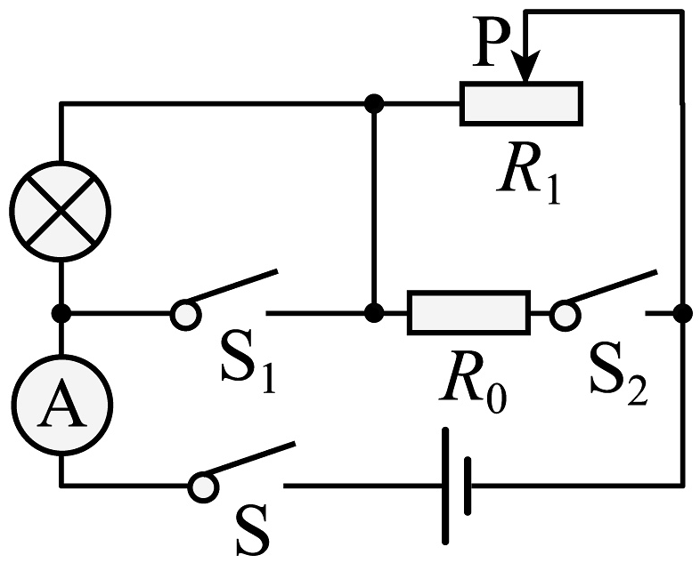 20、如图所示,电源电压恒为9V,的阻值为45Ω,滑动变阻器的规格为“30Ω;1A”,电流表的量程为“0~3A”,小灯泡上标有“3V;1.5W的字样。S闭合,、均断开,调节滑动变阻器的滑片P的位置,使小灯泡正常发光。求:(1)、小灯泡正常发光的电流。(2)、灯泡正常发光时,滑动变阻器的阻值。(3)、当S、和均闭合时,电路消耗的最小功率。