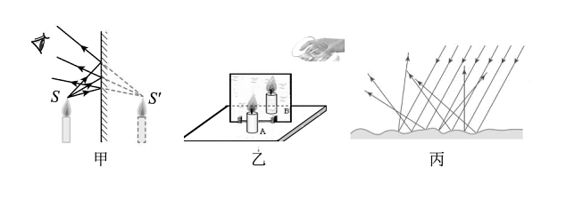 15、下列是探究光现象的四幅图,其中说法正确的是( )A、甲图所示,平面镜成像时进入眼睛的光是从像发出的 B、乙图所示,水浇不灭的烛焰是虚像 C、丙图所示,光的漫反射现象中,不遵守光的反射定律 D、丁图所示,人偶A可以从平面镜中“看到”人偶B,人偶B不能“看到”人偶A