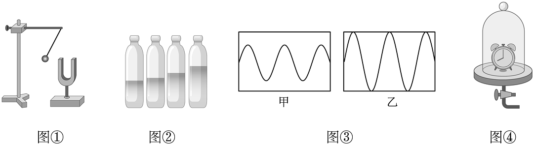 4、有关声现象,下列分析正确的是( )A、图①是探究声音产生原因的实验,该实验用到了理想实验法 B、图②中,用相同力度吹瓶子,从左往右音调逐渐降低 C、图③中,甲、乙两幅波形图均为乐音的波形图,音调最高的是乙,响度最小的是甲 D、图④是探究声音传播条件的实验,随着空气抽出,听到声音的音调不变,响度减小