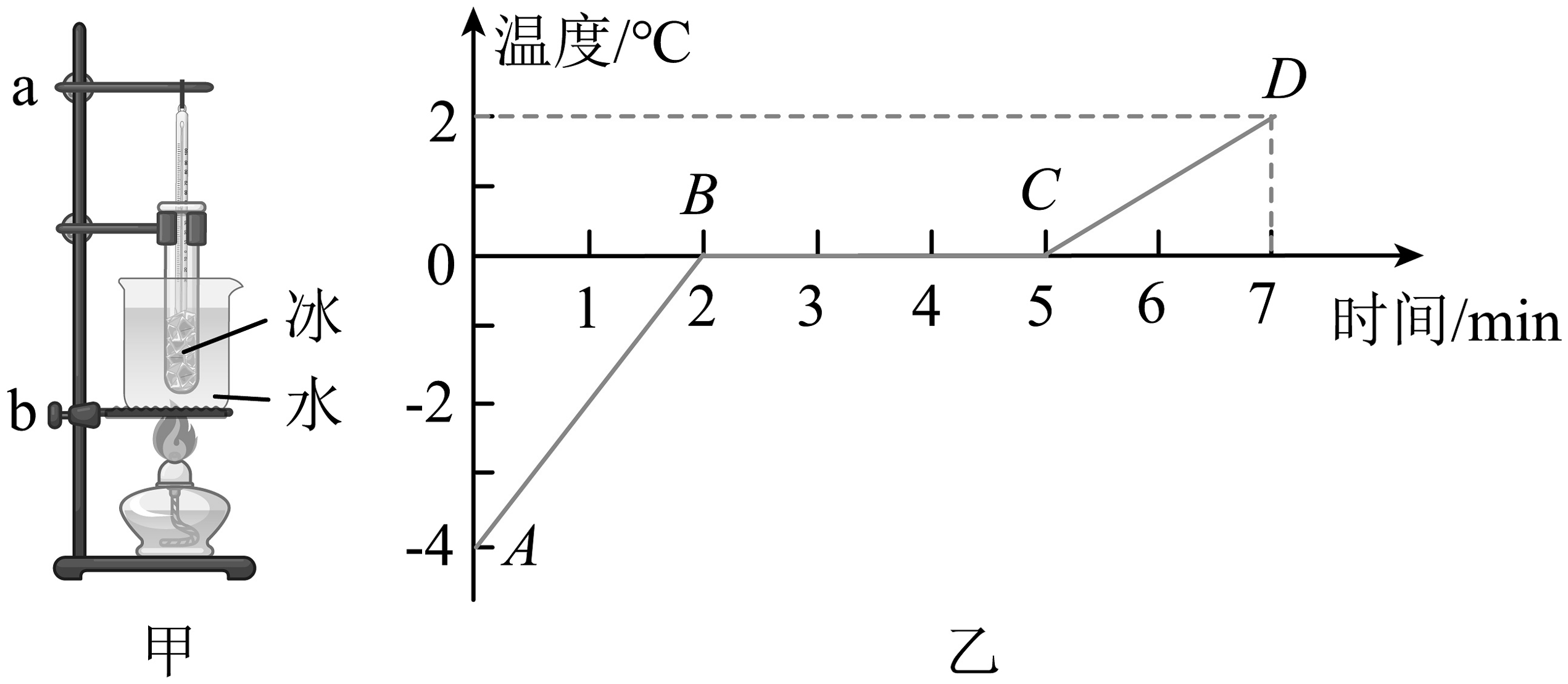 2、小明利用如图甲所示的装置探究“冰熔化过程中温度变化的特点”。(1)、在组装如图甲所示的装置时,应按(选填“自上而下”或“自下而上”)的顺序组装。(2)、根据实验数据,小明绘制出的冰的温度随时间变化的图像如图乙所示。分析图像可知: