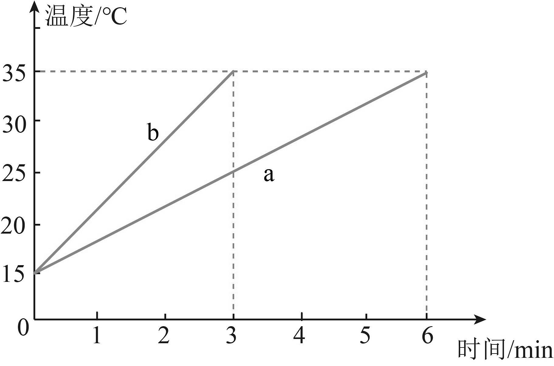20、质量和初温相同的a、b两种液体,使用完全相同的电加热器对其加热,每隔一段时间用温度计分别测量它们的温度,并画出了温度随时间变化的图像如图,由图像可知,表述正确的是( )A、a液体比热容小 B、由图像可知,a、b液体的比热容之比4∶5 C、0~3min内a液体吸收的热量少 D、升高相同的温度时,b液体吸收的热量少