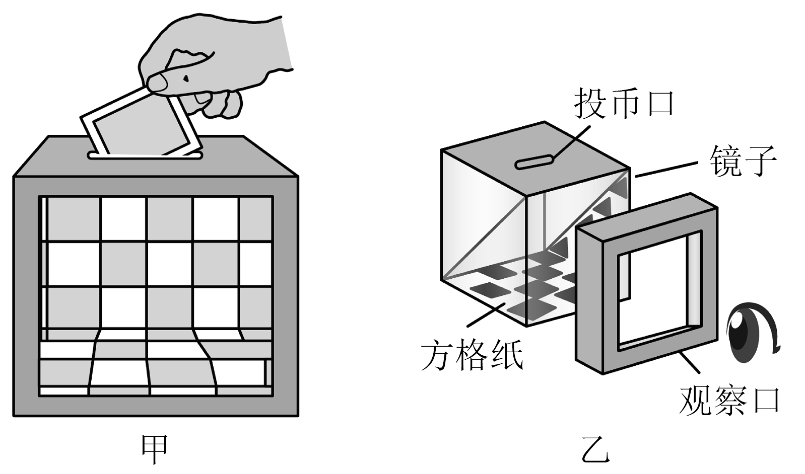 19、小明将只有一面开口的魔箱面向同学,把纸币从顶部的投币口放入(图甲),纸币竟不翼而飞。打开魔箱,原来里面有一块镜子(图乙),下列说法正确的是( )A、魔箱中的镜子是凸透镜 B、看到的魔箱中的竖直方格是实像 C、镜子与水平面的夹角为 D、魔箱的成像原理是光的反射