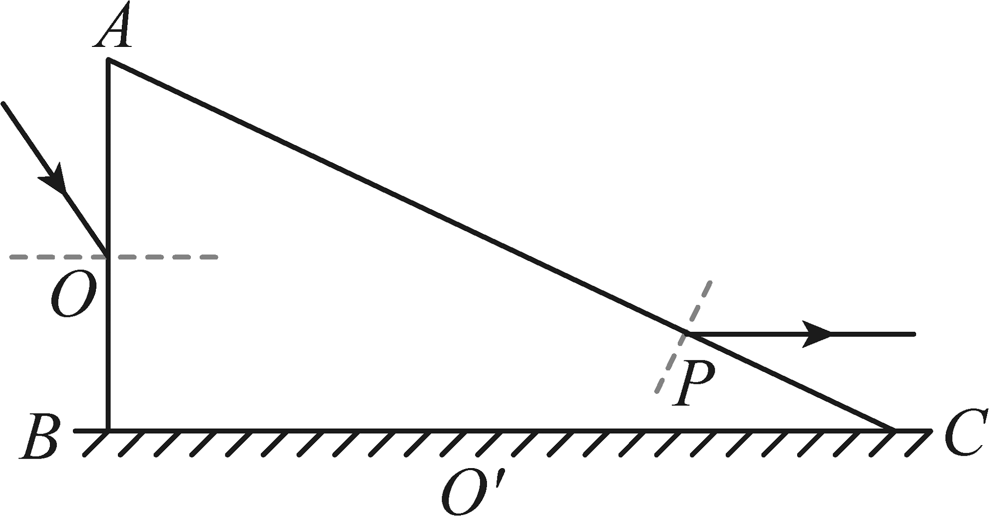 14、物理兴趣小组的同学在实验室找到一棱镜,其横截面为直角三角形ABC,如图所示,其中BC面镀银。一条光线从AB面上的O点射入棱镜,经过BC面一次反射后,从AC面的P点出射。请在答题卡的图中画出该光线射入棱镜之后的光路图。