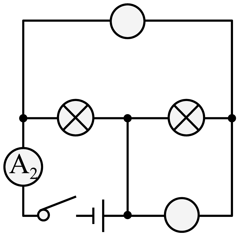 2、如图,闭合开关,两灯正常发光,请在圆圈中填入合适的电流表或者电压表。