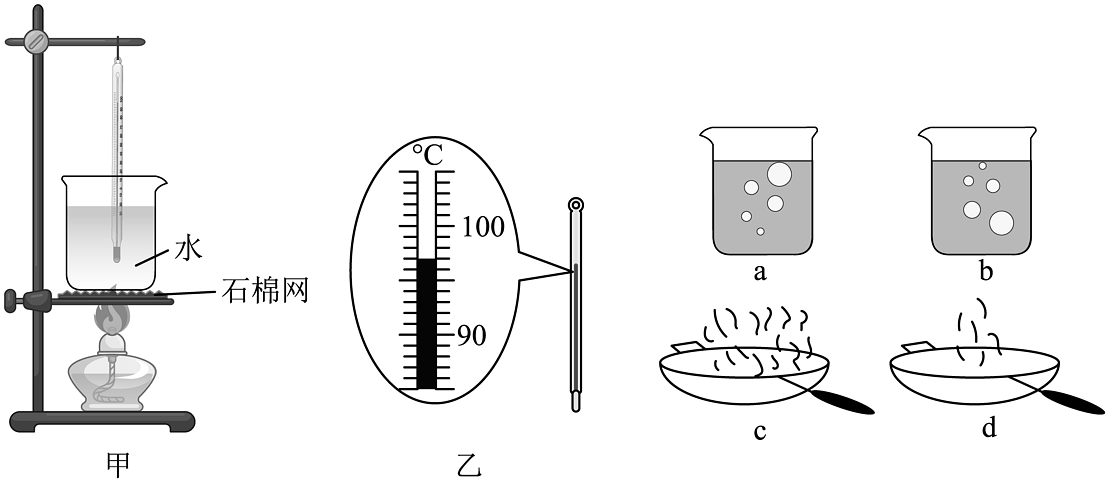 2、小明用如图甲所示的装置做“观察水的沸腾”实验,当水温为82℃时开始记录数据,以后每隔1min记录次温度计的示数,直到水沸腾段时间后停止读数。(1)、图甲安装实验器材时,应按照(选填“自上而下”或“自下而上”)的顺序进行;图乙是第3分钟时读数示意图,温度计显示的温度是℃;(2)、图(a/b)所示的情形表示水正在沸腾时气泡上升的情况,撤去酒精灯后,小明发现水未立即停止沸腾,其可能原因是:;(3)、细心的小明还发现,冬天在煤气灶上烧菜的时候,火焰熄灭前、后一瞬间会出现如图所示的两种情景,你可以确定(c/d)图是火焰熄灭后瞬间的图片;锅的上方产生的“白气”实质上是水蒸气经过(填物态变化名称)形成的。