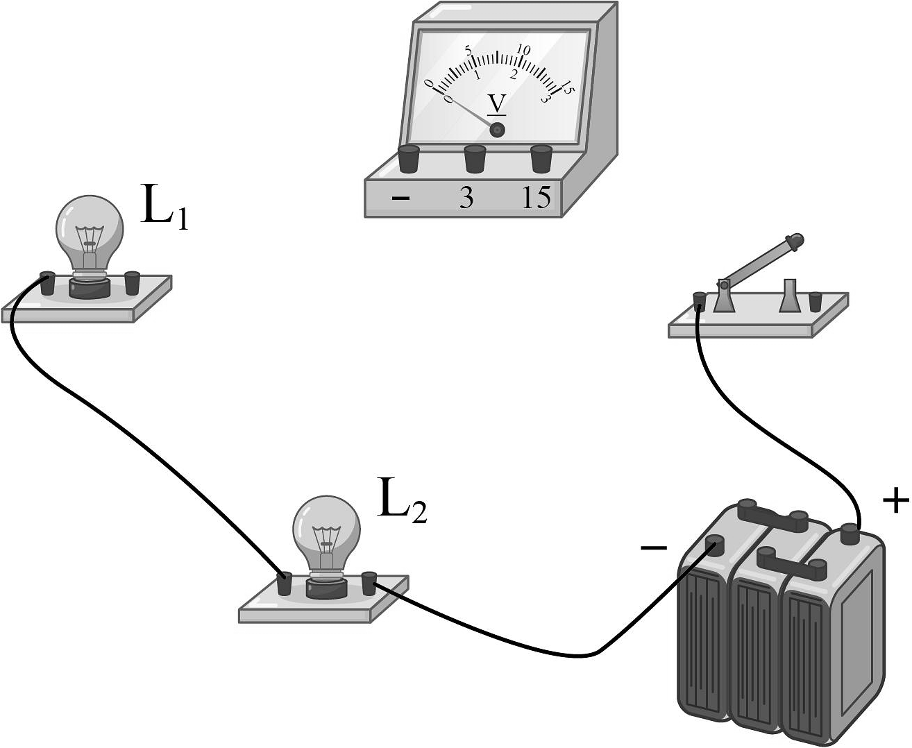 3、如图所示电路,请用笔画线代替导线完成电路连接。要求:两灯串联,开关同时控制两灯,电压表只测两端的电压,导线不能交叉,不考虑电表量程的选择。