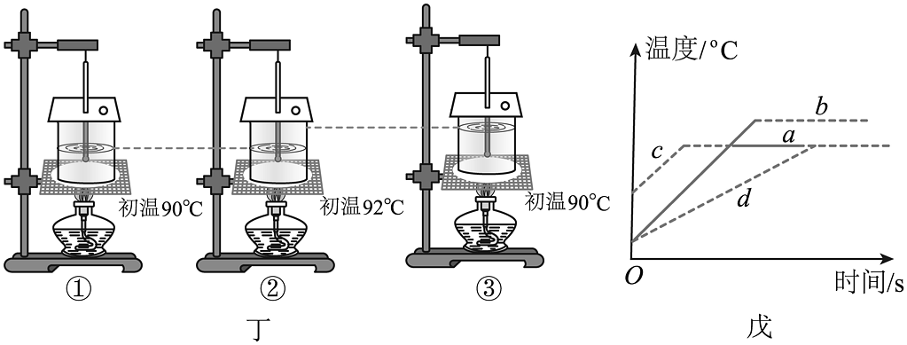 (4)、从实验数据可知,水的沸点是℃,则此时当地大气压(选填“高于”“等于”或“低于”)1标准大气压;(5)、其他三位同学分别采用丁所示的三幅实验装置进行了实验,根据各自记录的数据,分别画出水温随时间变化的图像,如图戊所示,则用图①装置做实验作出的图像是a;用图②装置做实验作出的图像是c;用图③装置做实验作出的图像是(选填:“a”、“b”、“c”或“d”)。 -