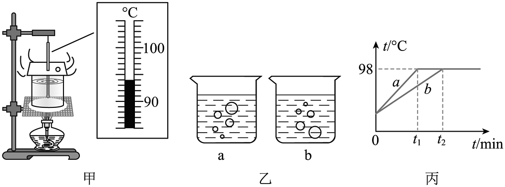 1、物理兴趣小组利用图甲所示的实验装置探究“水沸腾温度变化的特点”。(1)、组装甲图时,应按照(选填“自上而下”或“自下而上”)的顺序安装器材;(2)、当水温接近90℃时,每隔1min记录一次温度在下列表格中,第2分钟时温度计的示数如图甲所示,其示数是℃,此时水中气泡的变化情况是图乙中的(选填“a”或“b”);(3)、分析表3中实验数据可知:水沸腾的过程中,要不断吸收热量,温度(选填“升高”、“不变”或“降低”);