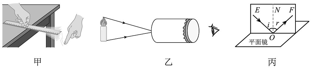 2、(1)、如图甲探究“声音的特性”时,改变钢尺伸出桌边的长度,再次拨动,使钢尺每次振动的幅度大致相同,听它振动发出的声音,同时注意钢尺振动的快慢。实验发现:尺子伸出桌面的长度越长振动越(选填“快”或“慢”),发出声音的音调越(选填“高”或“低”)。(2)、兴趣小组成员用图乙所示装置做小孔成像实验,发现无论什么样形状的小孔,都能看到薄膜上成一个蜡烛倒立的像,由此可知像的形状与小孔的形状(选填“有关”或“无关”),这是光的现象。(3)、如图丙所示,在探究光反射时的规律实验中,通过实验可知,反射光线、入射光线和法线都在(选填“同”或“不同”)一平面内,反射角r(选填“等于”、“大于”或“小于”)入射角i。