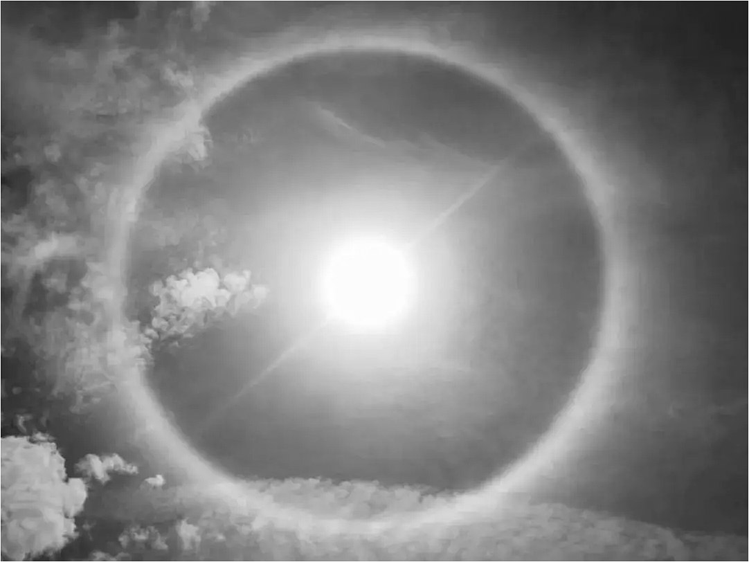 12、2023年5月13日,我国多个地区的人们看到太阳的周围出现一个彩色的光圈,如图所示,这是一种罕见的天象一日晕,它是光透过高空云层中的冰晶形成的(选填“反射”或“折射”),这种现象说明太阳光(选填“是”或“不是”)单色光。