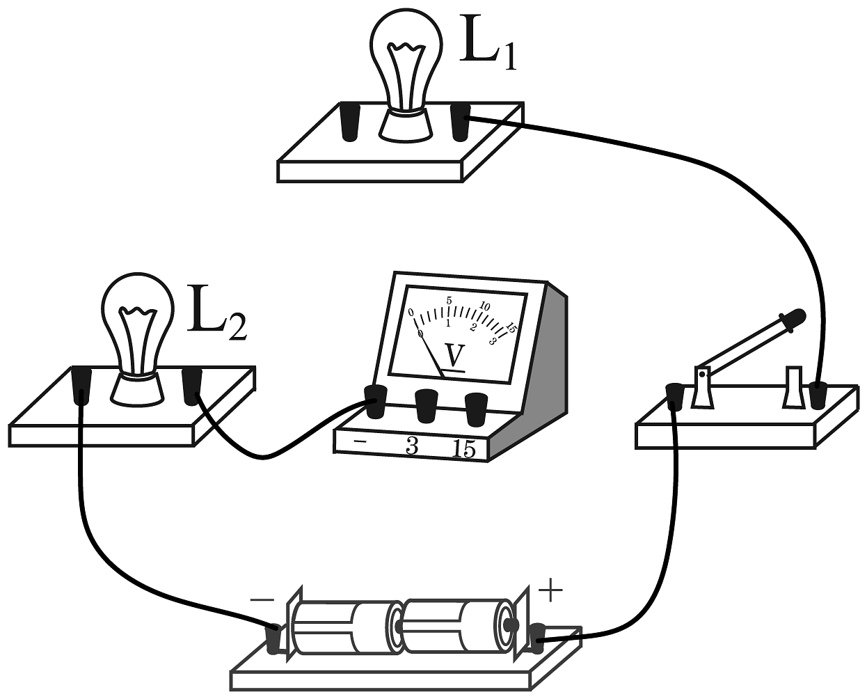9、请在图中用笔画线代替导线连接电路。要求:两灯串联,电压表只测量L1两端的电压。