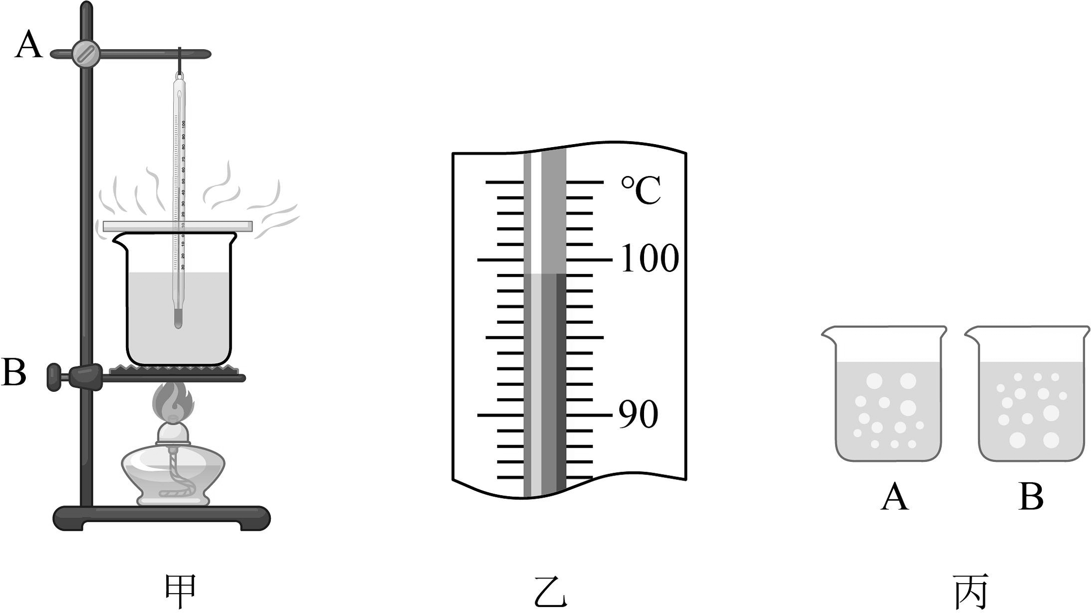 18、利用如图甲的装置探究水沸腾时温度变化的特点。(1)、除温度计外,还需要的测量工具是;(2)、按照实验规范要求,调整铁圈B,确定其高度时,(选填“需要”或“不需要”)点燃酒精灯;(3)、组装好实验器材后,小明在烧杯中倒入适量温水,用温度计来测量烧杯中水的温度,读数时视线应与温度计液柱的上表面;实验中水沸腾时温度计的示数如图乙所示,此时水的沸点是℃;(4)、水在沸腾过程中温度一直保持不变,由此可知水沸腾时的特点是:;(5)、在实验中,烧杯中的水处于沸腾状态时,小明观察到水中气泡的情形如丙图(选填“A”或“B”)所示。