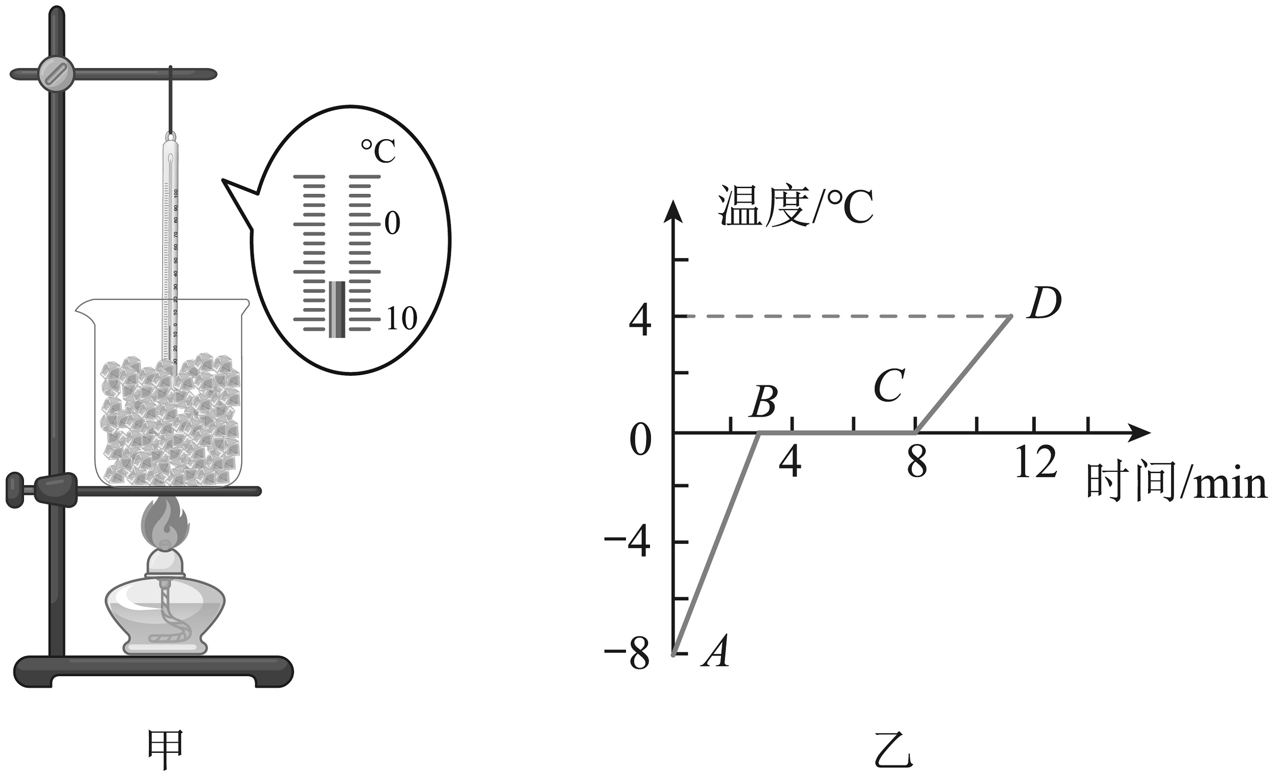 17、小明所在的学习小组开展了“冰熔化时温度的变化规律”的实验探究,在标准大气压下,利用如图甲所示的实验装置进行探究。(1)、图甲装置中,石棉网的主要作用是;实验过程中温度计的示数如图甲所示,示数℃;(2)、根据实验数据,小明作出了冰熔化时温度随时间变化的图像(图乙),由图像可推知冰属于(选填“晶体”或“非晶体”);冰的熔点是℃;(3)、该物质在第5min时,处于(选填“固态”“液态”或“固液共存”)状态;(4)、冰在熔化过程中(选填“吸收”或“放出”)热量,温度。
