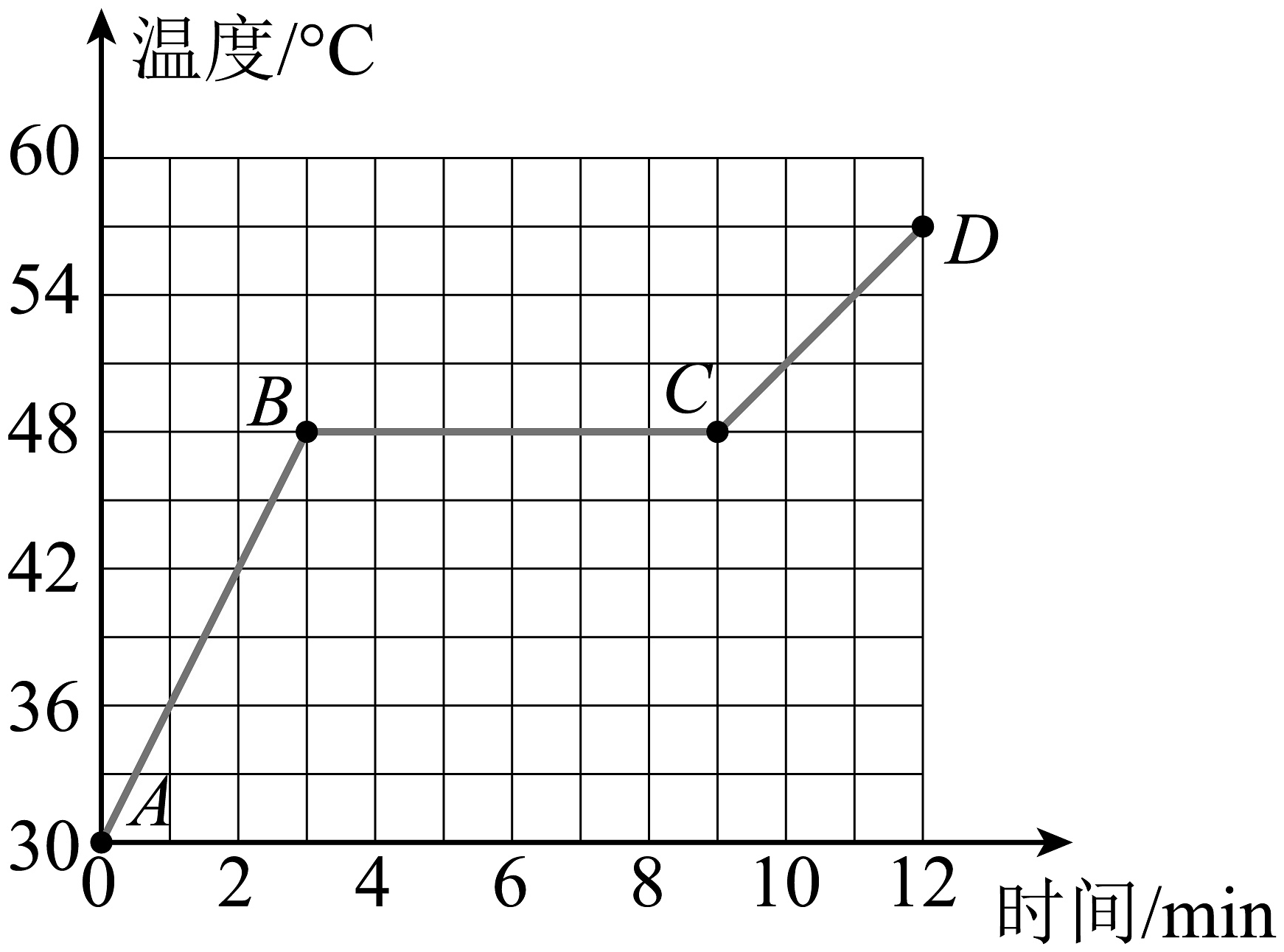 3、图示为某种物质熔化时温度随时间变化的图像。根据图像,下列判断正确的是( )A、该物质熔化过程持续了9min B、该物质是晶体,熔点为48℃ C、在第11min,该物质处于固液共存状态 D、在第3min到第9min之间,由于物质温度不变,所以不吸收热量
