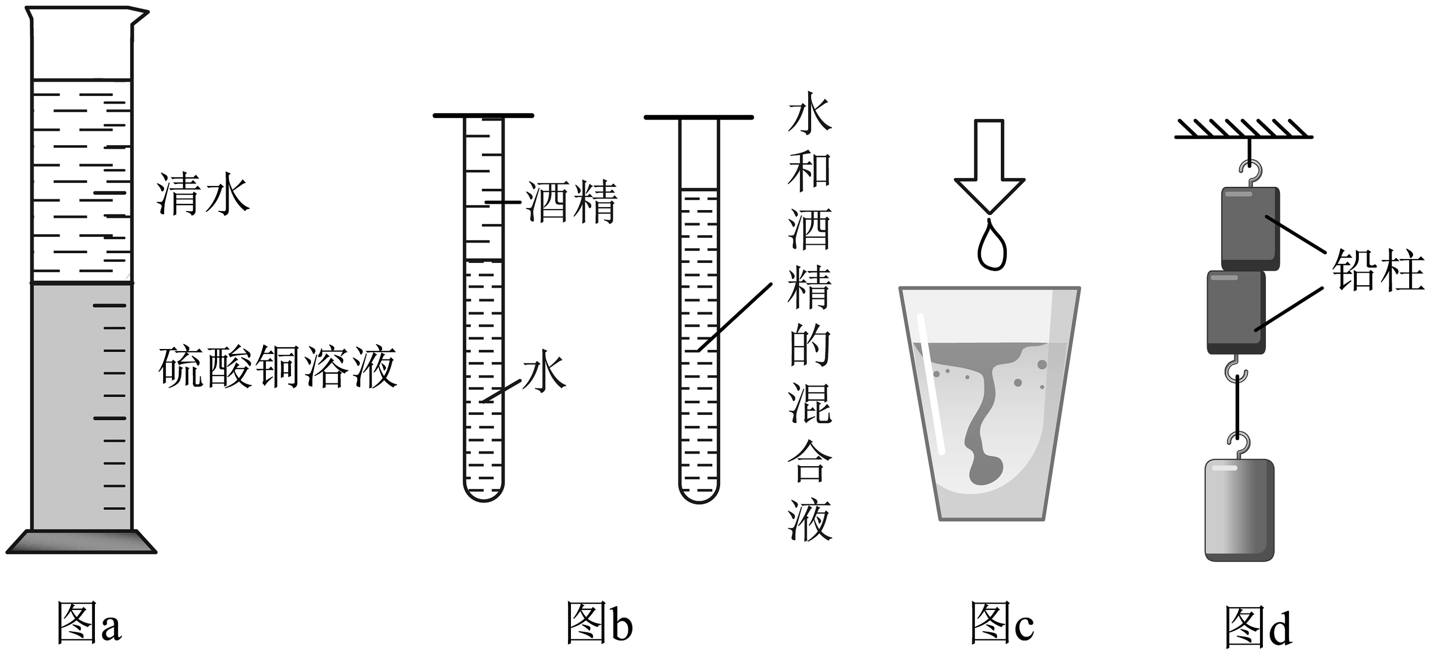 b:分别在玻璃管中倒入水和酒精,让它们充分混合;
