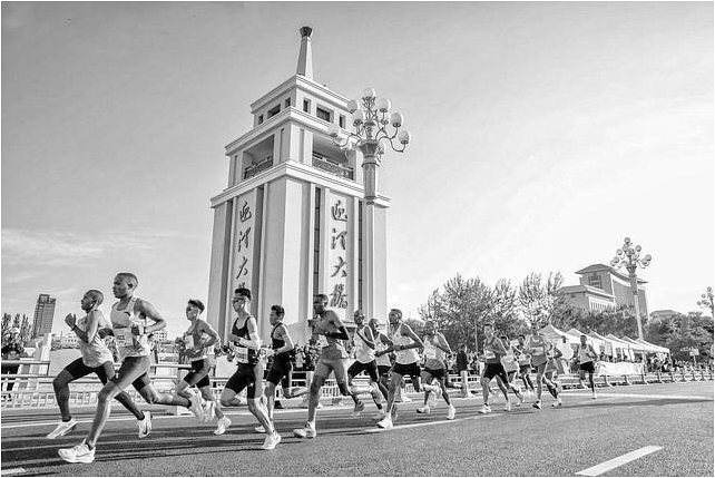 11、2024年9月22日7时30分,2024太原马拉松赛在山西省太原市迎泽大街鸣枪起跑。如图所示的是参赛选手在迎泽大桥上奔跑的情景,若认为迎泽大桥是静止的,所选的参照物是( )A、奔跑中的运动员 B、桥下的汾河水 C、道路旁陪跑的观众 D、路旁的路灯