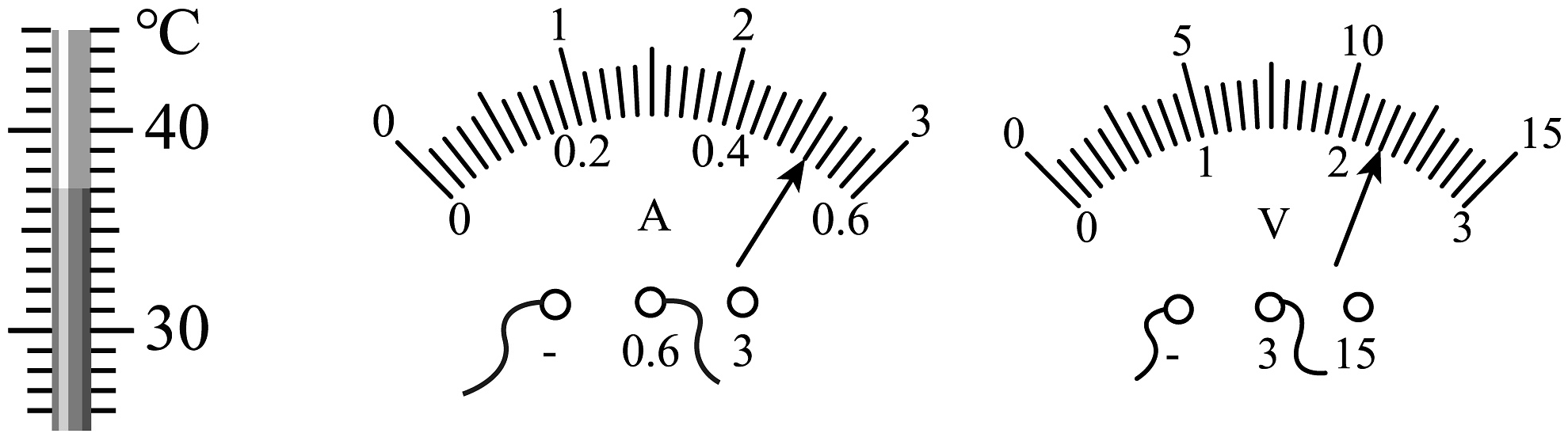 13、如图所示,温度计的示数为℃。电流表读数为A,电压表读数为V。