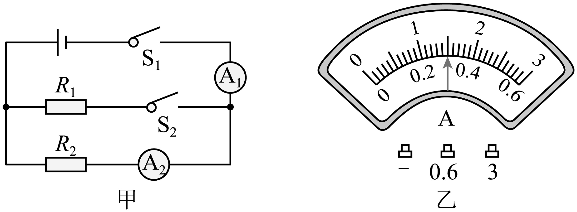 14、在甲图所示的电路中,闭合开关S1 , 再闭合开关S2 , 电流表A1的示数变大,此时两电流表指针都指在刻度盘的中央,均如乙图所示,则通过R1的电流为A,。