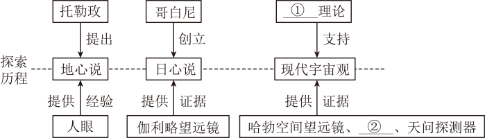 10、对《宇宙探秘》相关内容进行梳理,图中①、②位置内容填写正确的是A、宇宙大爆炸、中国天眼 B、星系远离我们、中国天眼 C、宇宙大爆炸、开普勒望远镜 D、星系远离我们、开普勒望远镜