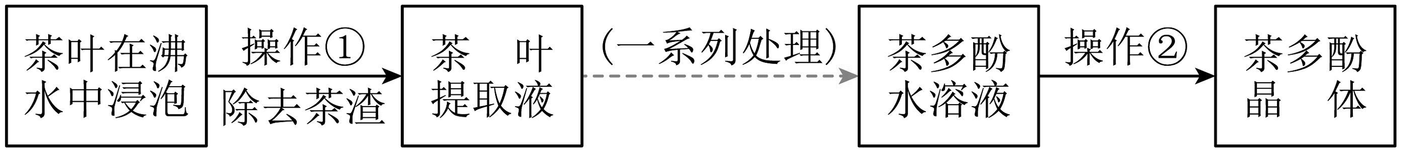 9、茶饮在我国具有悠久历史,茶叶中含有茶多酚,它是茶叶中酚类物质的总称。茶多酚是淡黄色粉状固体,易溶于水和乙醇,在空气中易氧化变色,略有吸水性,耐热性及耐酸性好,能抗衰老、抗辐射、抗菌杀菌,从茶叶中提取茶多酚的流程如下图所示:(1)、从物质分类来讲,茶多酚属于(填“纯净物”或“混合物”)。(2)、上述实验过程中操作①的名称为。(3)、硬水中的钙镁离子会抑制茶叶中茶多酚的溶解,用软水泡茶则可最大程度保持茶的各种营养成分,生活中将硬水软化的方法是。