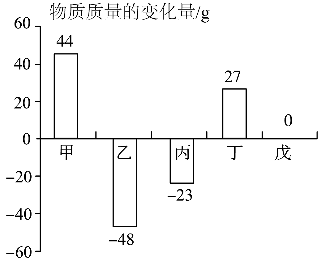 10、在一个密闭容器中,有甲、乙、丙、丁、戊五种物质,在一定条件下发生反应,测得反应前后各物质的质量变化量如图所示(图中正数表示物质质量的增加量,负数表示物质质量的减少是,0表示物质质量不变),下列说法正确的是A、该反应一定属于化合反应或分解反应 B、戊一定是该反应的催化剂 C、参加反应的乙、丙的质量比一定为48:23 D、该反应中甲、丁的相对分子质量之比一定为44:27