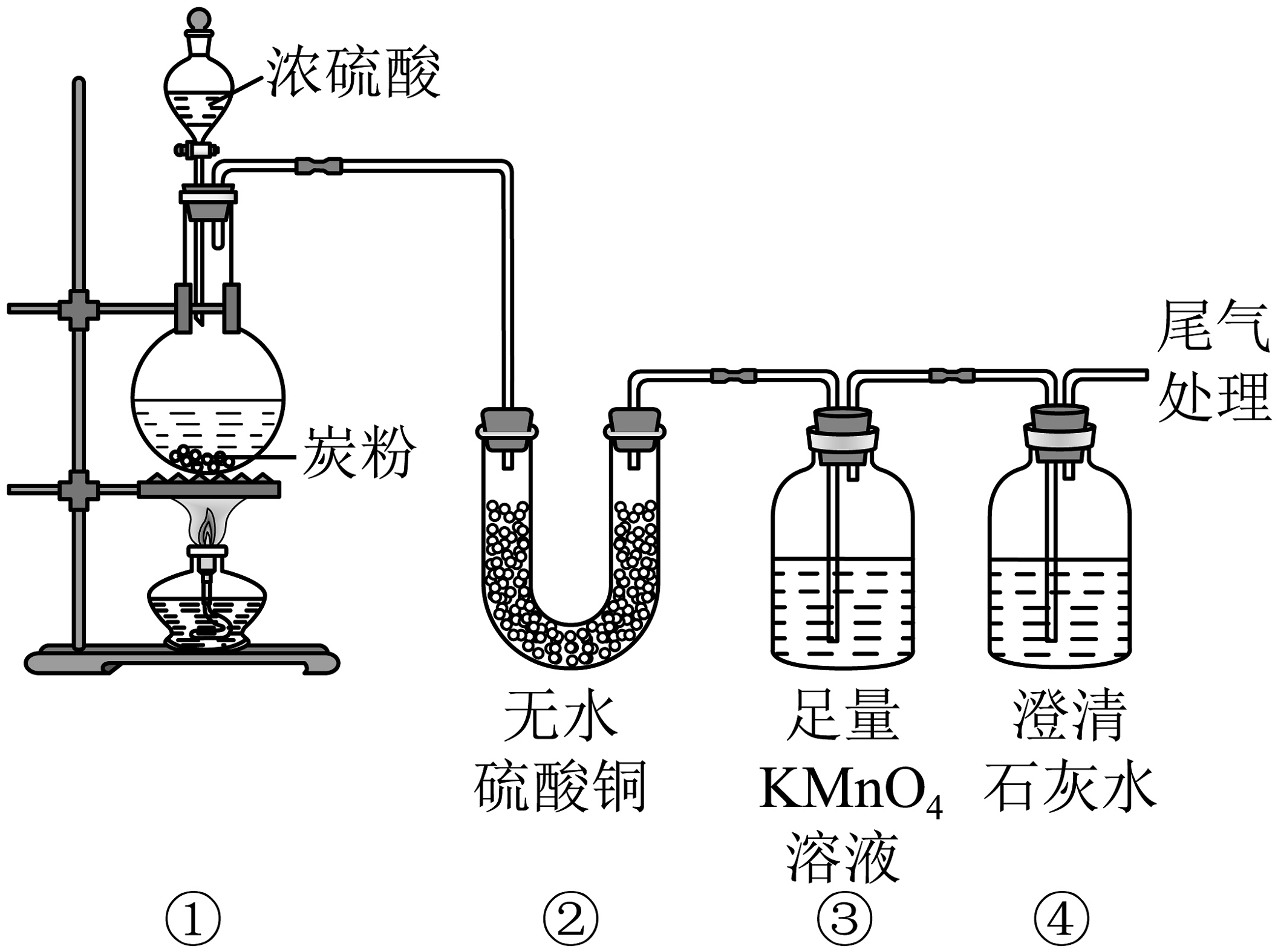 13、SO2能使澄清石灰水变浑浊。用如图装置研究炭粉与浓硫酸反应的产物。下列说法不正确的是A、装置②用于检验混合气体中是否有H2O B、装置③中溶液颜色变浅,说明反应产物中有SO2 C、装置④中澄清石灰水变浑浊,说明反应产物中有CO2 D、装置③、④互换位置,不影响CO2和SO2的检验