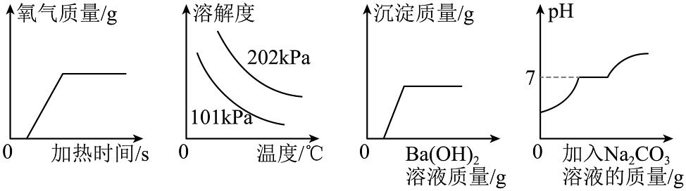 8、如图所示的四个图像分别对应四种过程,其中不正确的是A、加热一定质量的高锰酸钾 B、某气体溶解度随温度和压强的变化 C、向一定量的硫酸钠和盐酸的混合溶液中加入Ba(OH)2溶液 D、向盐酸和氯化钙的混合溶液中不断滴加碳酸钠溶液