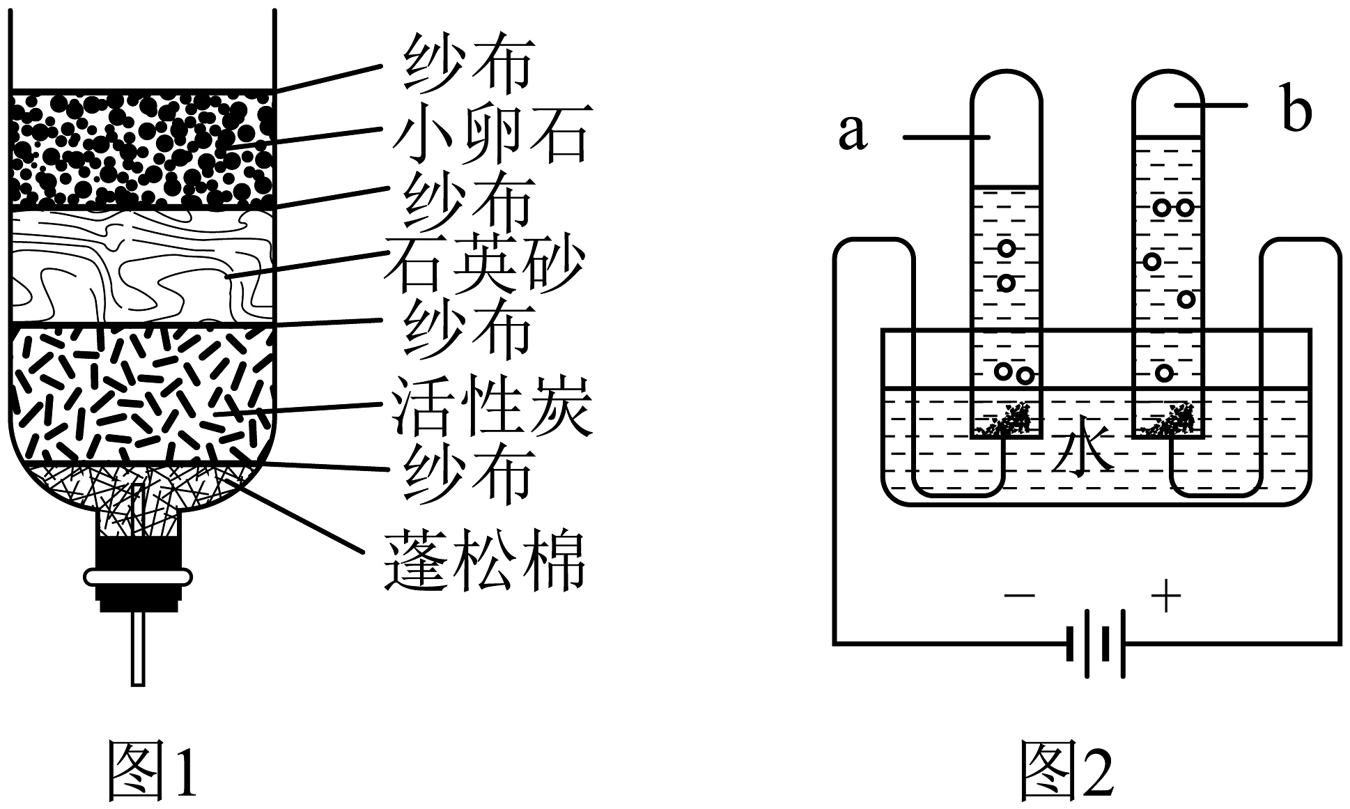 (2)、将浑浊的河水用图1所示的简易净水器进行净化,其中活性炭的作用是 , 用此装置净化后得到的水属于(填“纯净物”或“混合物”)。(3)、图2是电解水实验装置。在实验过程中,试管产生的气体是 , 正极与负极产生的气体体积比为 , 写出水在通电条件下反应的化学方程式。 -