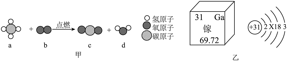 12、2023年7月12日朱雀二号成功发射,它是全球首枚以液氧液态甲烷(CH4)为推进剂的运载火箭。请结合题图,回答下列小题(1)、液态甲烷燃烧的微观示意图如图甲所示,下列说法错误的是A、反应前后分子数目不变 B、反应前后元素种类不变 C、a分子中碳、氢原子个数比为1:4 D、反应生成c、d的质量比为22:9(2)、镓是火箭上重要半导体材料,镓元素相关信息见图乙,下列有关镓元素说法错误的是A、镓元素为金属元素 B、镓原子的中子数是31 C、图中X的数值是8 D、镓的相对原子质量是69.72