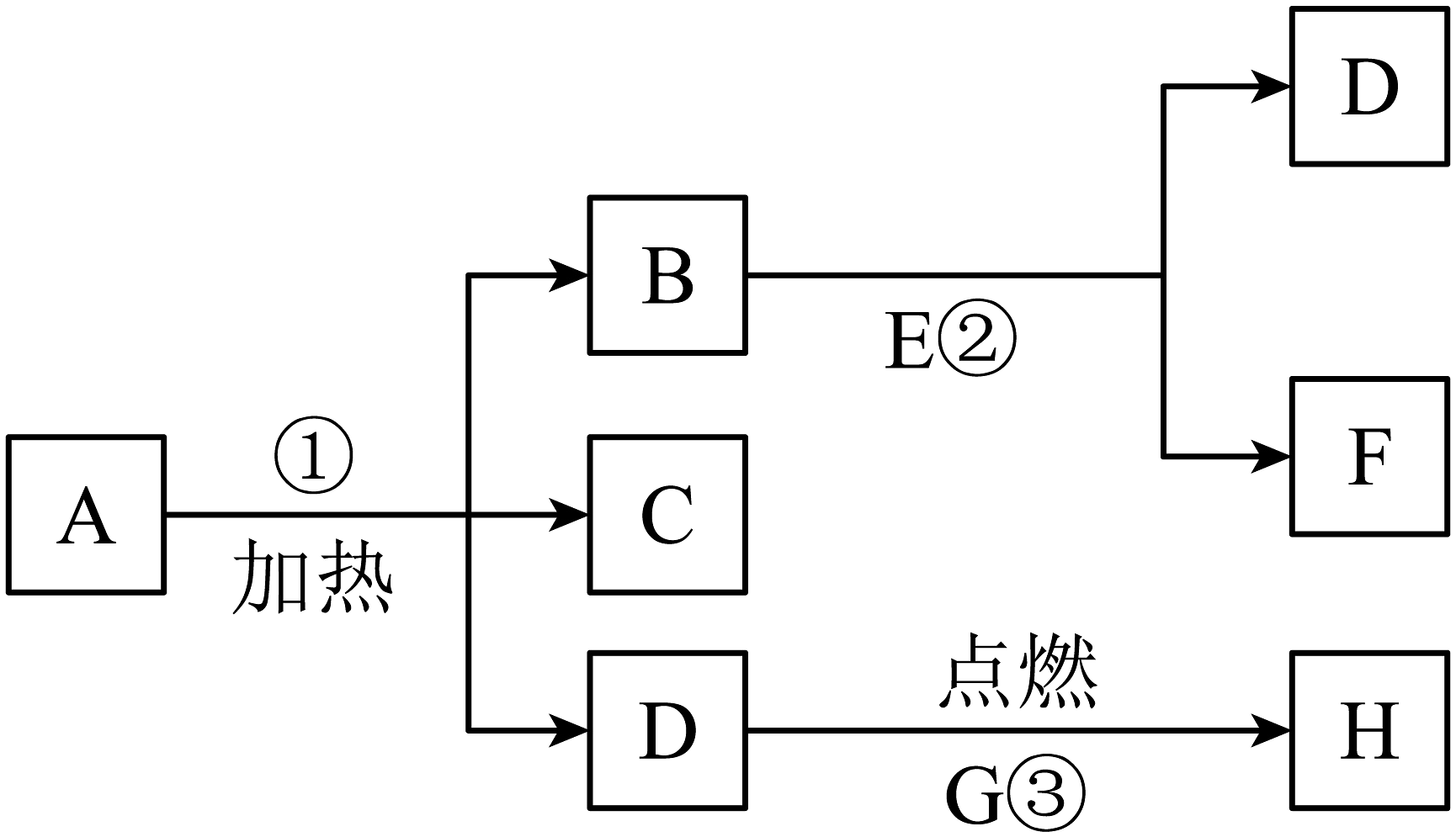 18、A-H是初中常见的八种物质,有如下图所示关系,“→”表示一种物质能生成另一种物质,其中A是一种暗紫色固体,D能使带火星的木条复燃,F是一种最常见的液体,反应③剧烈燃烧、火星四射,并且H是一种黑色的固体,在反应②前后B的质量和化学性质均不改变。试推断:(1)、写出物质名称E:、H:。(2)、反应②中B物质的作用是。(3)、写出反应①的文字表达式。