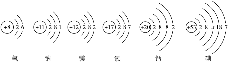 8、如图为6种原子的结构示意图:(1)、图中六种元素之间的最本质区别是.(2)、镁原子在化学反应中容易失去2个电子形成镁离子,镁离子的化学符号为;氧化钠由钠离子和氧离子构成,氧化钠的化学式为.(3)、从原子结构上分析,图中哪两种元素具有相似的化学性质(填元素符号)、.(4)、在上述碘的原子结构示意图中,x=.