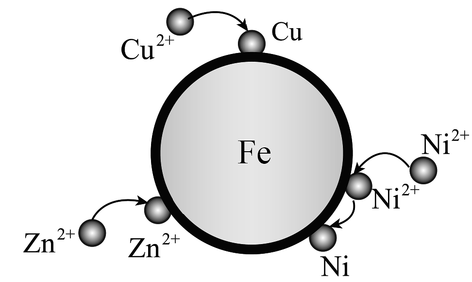 8、纳米零价铁(nZVI)除废水中金属离子的性能优越,制备示意图为:(1)、“聚集”过程,铁元素化合价(填“升高叶降低”或“不变”):(2)、雾化”过程,发生反应:FeCl3+3H2O=Fe(OH)3+3X,则X的化学式为;(3)、nZVI用于去除废水中金属离子,根据金属活动性顺序可分三种途径(如图所示),第一类是吸附捕捉(如Zn2+),第二类是吸附捕捉再慢慢反应(如Pb2+),第三类是直接反应(如Cu2+)。