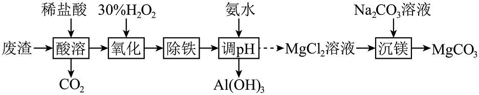 (1)、“酸溶”时,MgCO3与稀盐酸反应的化学方程式为。在该步骤需加入稍过量的稀盐酸,物质间共发生(填“1”或“2”或“3”或“4”)个复分解反应。(2)、“氧化”时发生的反应为2FeCl2+2HCl+H2O2=2FeCl3+2H2O。即可观察到的反应现象是。(3)、“调pH”时,需控制溶液pH的范围为。(4)、"沉镁”时,为提高MgCO3的纯度,试剂加入顺序为(填“a”或“b”)。a.向MgCl2溶液中逐滴加入Na2CO3溶液