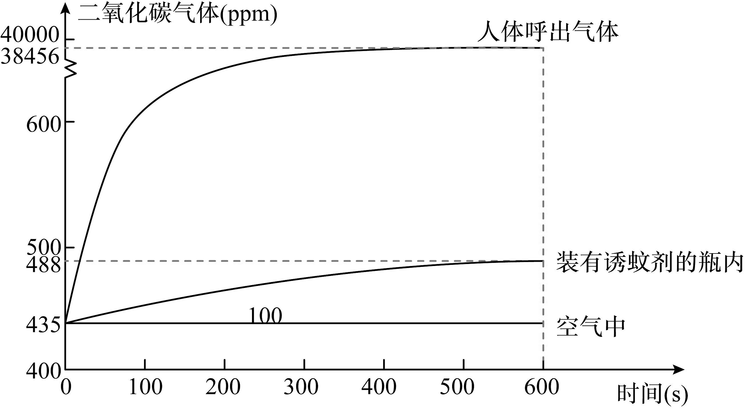【实验探究】小明利用CO2传感器测定人体呼出气体、装有诱蚊剂的瓶内、空气中CO2含量变化。实验结果如图所示,人体呼出气体中CO2含量相对较(填“高”或“低”)。