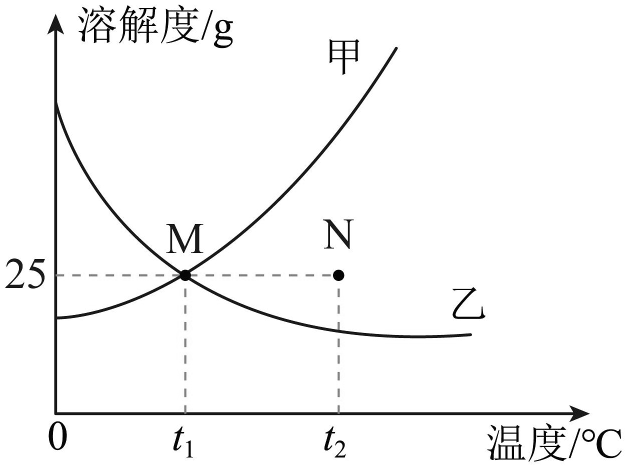 17、如图为甲、乙两种固体物质在水中的溶解度曲线,下列说法正确的是A、甲的溶解度受温度的影响变化不大 B、若甲中含有少量乙,可用蒸发结晶的方法提纯甲 C、t1℃时,100g甲物质的饱和溶液中溶质的质量是25g D、t2℃时,欲将N点的甲物质溶液变为饱和溶液可采用加入适量甲的万法