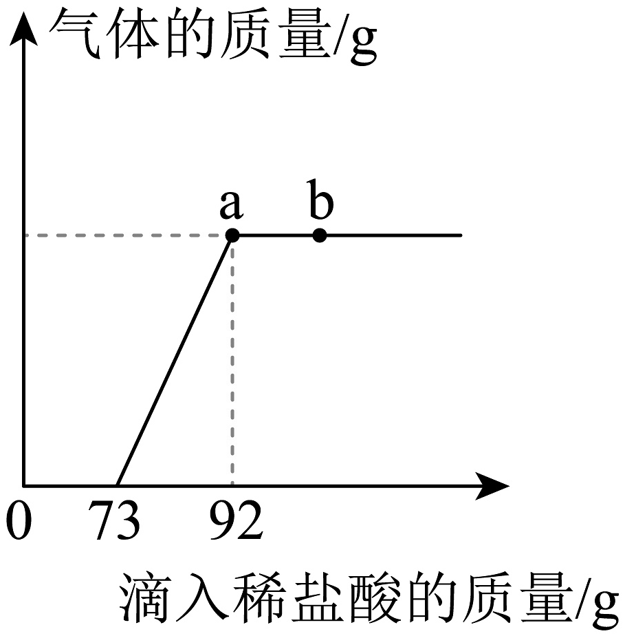 8、实验室有一瓶已经部分变质的固体,现向锥形瓶中加入10g这种部分变质的样品,再加入溶质质量分数为10%的稀盐酸溶液,产生气体的质量与加入稀盐酸溶液的质量关系如图所示:(1)、与反应消耗的稀盐酸的质量为g。(2)、b点溶液中的溶质是(填化学式)。(3)、求原样品中的质量分数(写出计算过程)。