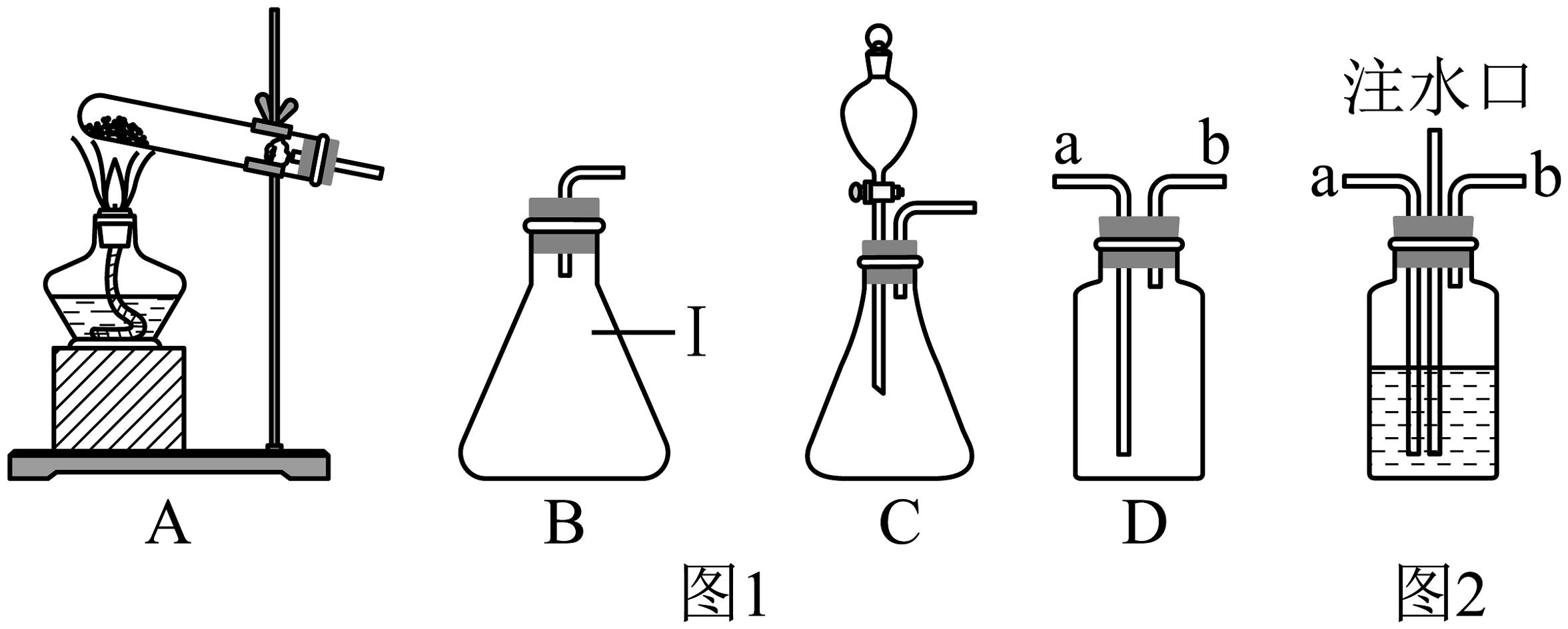19、在实验室里用加热氯酸钾与二氧化锰的混合物来制取氧气,合适的实验装置是(部分夹持装置已略去)A、