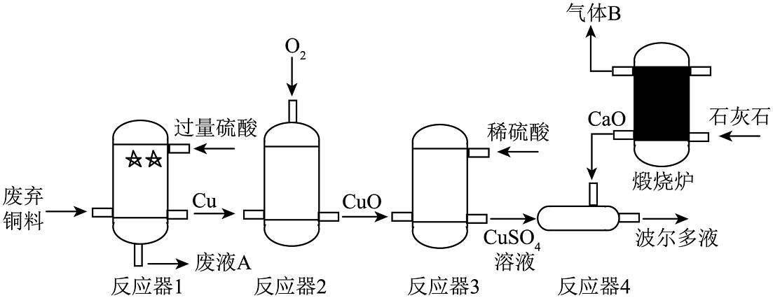 7、利用废弃铜料(含有铜、铁)和石灰石制备农药“波尔多液”的过程如图,请根据题意回答下列问题:(1)、废弃铜料加入反应器1前先要将其粉碎,其目的是 , 反应器1中硫酸加入过量的目的是。(2)、反应器2中发生的反应属于(填基本反应类型)反应。(3)、反应器3中发生反应的化学方程式是。(4)、写出一种气体B排放会导致的环境问题。