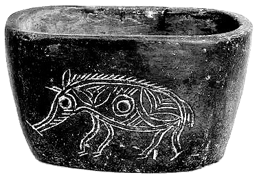 【简介】器表两面各刻猪鈇图像,形象介于野猪和家猪之间,器内壁较粗糙