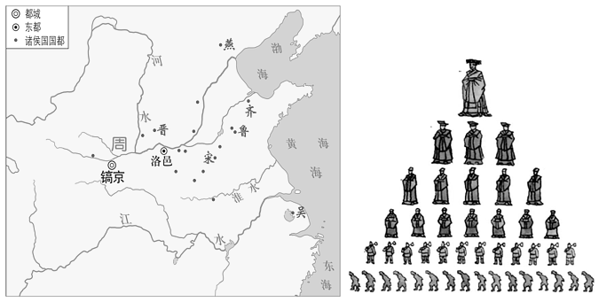 (1)、结合所学知识,将材料一中①②处应分别填写: , 。(2)、观察材料二,左图中“齐”、“鲁”、“吴”、“晋”、“宋”等诸侯国的出现与西周实行的什么政治制度有关?上图中,居于“金字塔”顶端的是谁?(3)、西周进行了政治制度创新,一度强大,但最终仍与夏商一样,走向灭亡。结合所学知识,指出这三朝灭亡的共同原因是什么?你能从中得到什么启示? -