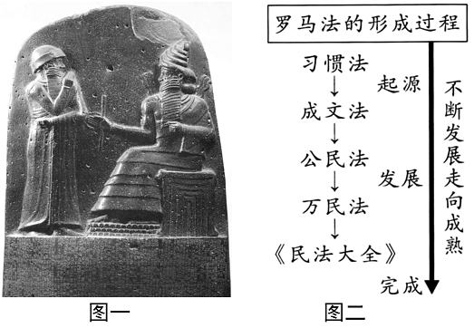 (1)、材料一中图一的内容出自于哪部法律文献?它在世界法制史上有何重要地位?图二中罗马法由习惯法到成文法的第一步是什么法律文件?(2)、材料二中图三D航线与哪一位航海家有关?图四中最能体现“三角贸易”本质的是哪一段航程?结合所学知识说明新航路开辟和“三角贸易”之间的内在联系。(3)、阅读材料五,图五把人类带入了一个什么新的时代?图六所示的重要发明的发明者是谁?图六中棉花加工量和生铁产量出现巨大变化的原因时什么?(4)、材料四中哪些能源和机器的应用导致了英国的环境问题,请各举一例。 -